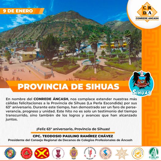 El presidente CPC. TEODOSIO PAULINO RAMIREZ CHAVEZ y el Consejo Directivo 2023-2025 del Consejo Regional de Decanos de los Colegios Profesionales de Ancash saludan afectuosamente a la provincia de Sihuas por su 63° aniversario de creación política.