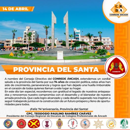 El Consejo Directivo 2023-2025 del Consejo Regional de Decanos de los Colegios Profesionales de Ancash se complace en extender un fraternal saludo a toda la población de la provincia del Santa en ocasión de conmemorarse el 74° Aniversario de su creación política.